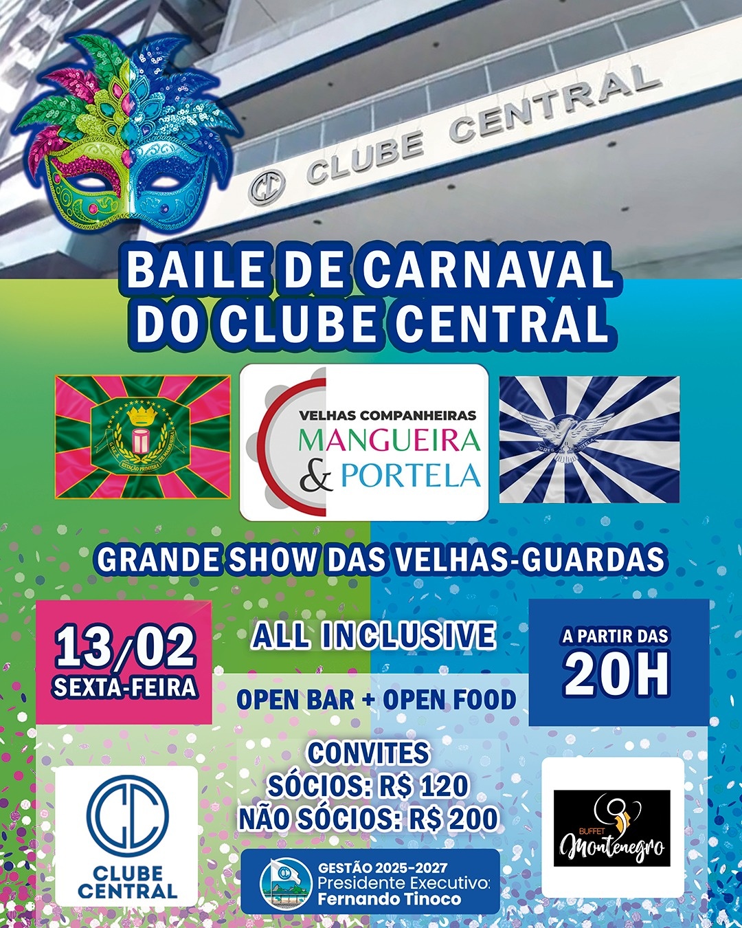 Imperdível e inesquecível. Dia 13, a partir das 20h, teremos o nosso Baile de Carnaval do Clube Central. “Velhas Companheiras: Mangueira e Portela” é o nome do show que vai embalar o nosso Salão Nobre.
